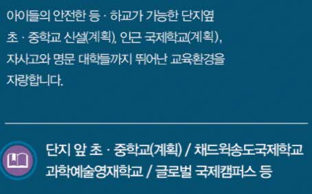 ㅇ 학군 : 단지 앞 초등 / 중학교(계획), 채드웍 송도 국제학교, 과학예술영재학교, 글로벌 국제캠퍼스 등